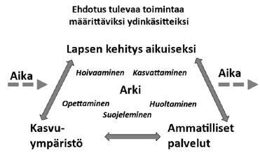 Lastensuojelun ja myös kaikkien muidenkin lapsiperheiden sekä lasten ja nuorten palveluissa yhteisenä nimittäjänä on lasten aikuistumisen tukeminen. Olen tätä tehtävää havainnollistanut tuoreessa kirjassani alla olevalla kuvalla.